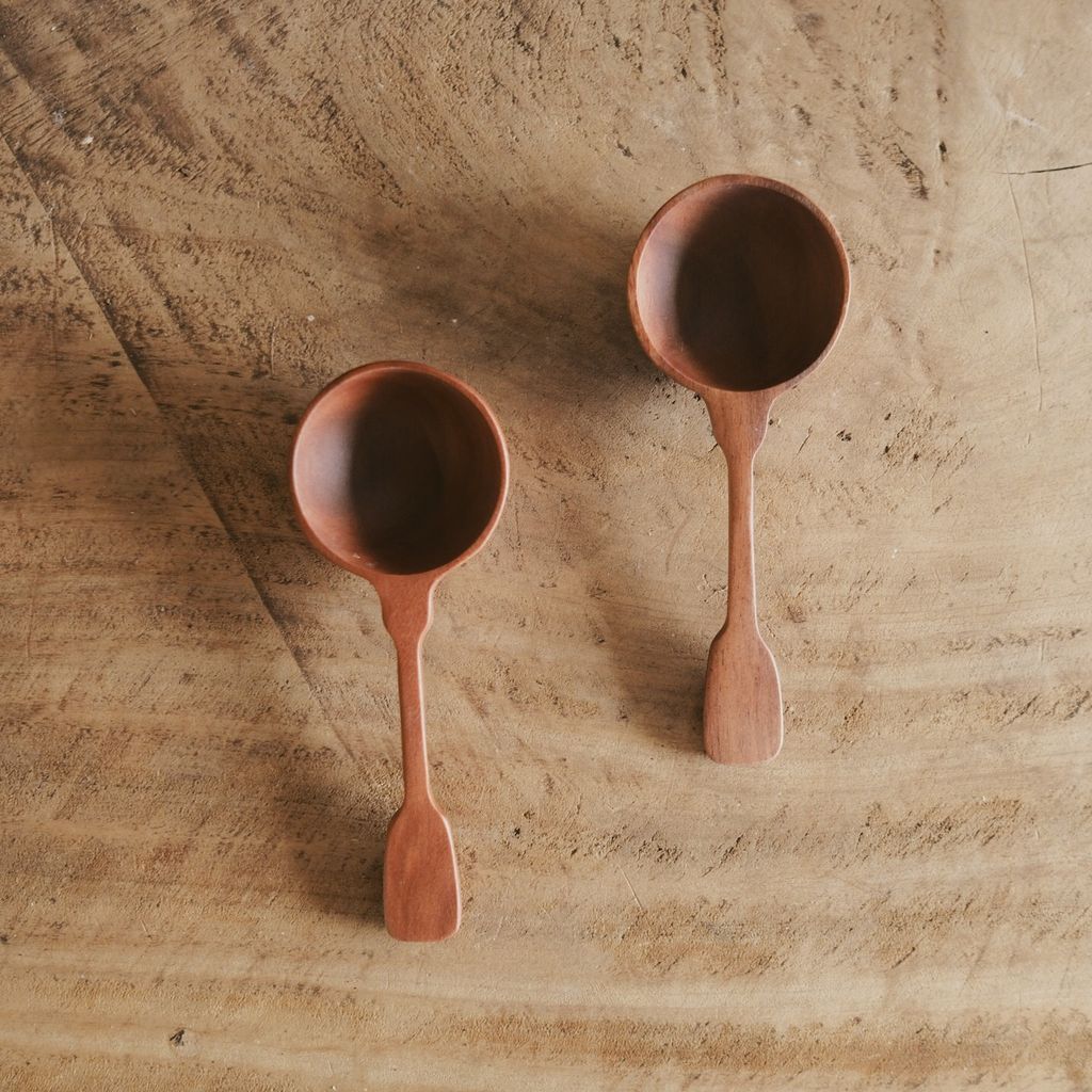 由天然木手作製成的木質咖啡勺,採用的是硬度相當夠的印尼果樹,在手工刨削成型上也相對較困難。這種木頭有著美麗的線條紋理,溫柔色澤由淺到深自然散發,無論是視覺觸覺都有極舒服的感受。木質餐具不會刮傷器皿,可天天使用。